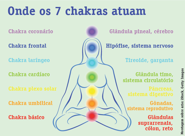 *CHAKRAS: Vem do sânscrito significando roda. São centros de força situados no corpo energético e que têm como função principal a absorção de energia do meio ambiente para o interior do campo energético do corpo físico. Além disso, servem de ponte energética entre o corpo espiritual e o corpo físico. Há 7 principais ligados as glândulas do sistema endócrino, mas tem muitos outros que regem o campo energético. São eles: coronário, frontal, laríngeo, cardíaco, umbilical, sexual e básico.